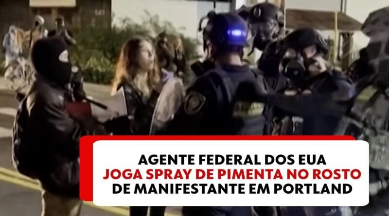 Um agente federal dos Estados Unidos foi flagrado jogando spray de pimenta no rosto de uma manifestante durante um protesto em Portland, no estado de Oregon, neste domingo (5).