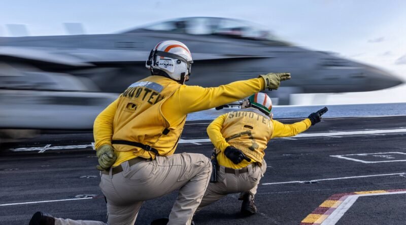 Caça de combate dos Estados Unidos decola, sob instrução de técnicos de voo, do porta-aviões USS Gerald Ford durante treinamento em outubro de 2025.