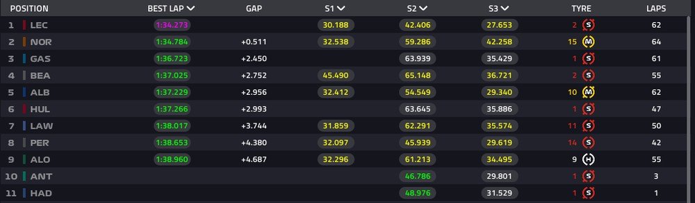 Vale lembrar, porém, que os tempos de volta são apenas uma referência e não necessariamente indicam a situação das equipes, já que os carros podem estar com muito ou pouco combustível, ou com um programa de testes diferente.