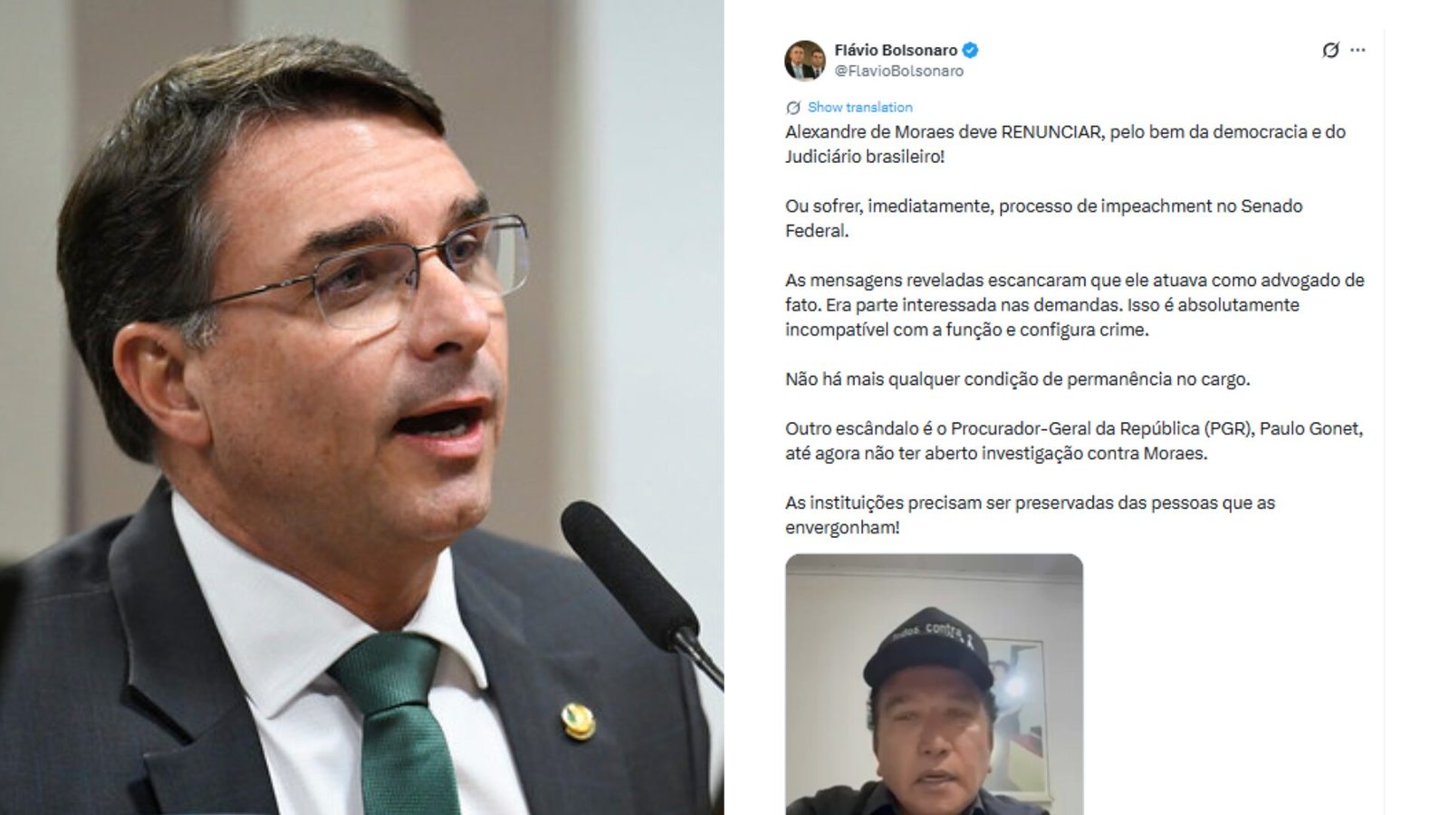 Na publicação, o parlamentar compartilha um vídeo do senador Magno Malta (PL-ES), que faz críticas ao ministro e afirma que Moraes não teria mais condições de permanecer no cargo. Ao divulgar o conteúdo, Flávio Bolsonaro afirmou que a saída do magistrado seria necessária para “preservar a democracia e o Judiciário brasileiro”.